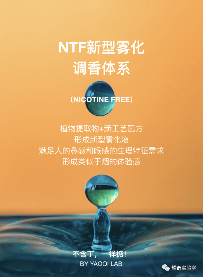 FY-NTF新型雾化液(NTF: NICOTINE FREE),作为第四代调香体系“NTF新型雾化调香体系”出品,历经实验室、定向内测、行业(设备)应用和客户(产品)应用四层测试,综合材料特质和市场分析,结合行业伙伴意见建议和客户反馈,不断完善工艺标准,丰富配方,构建体系。