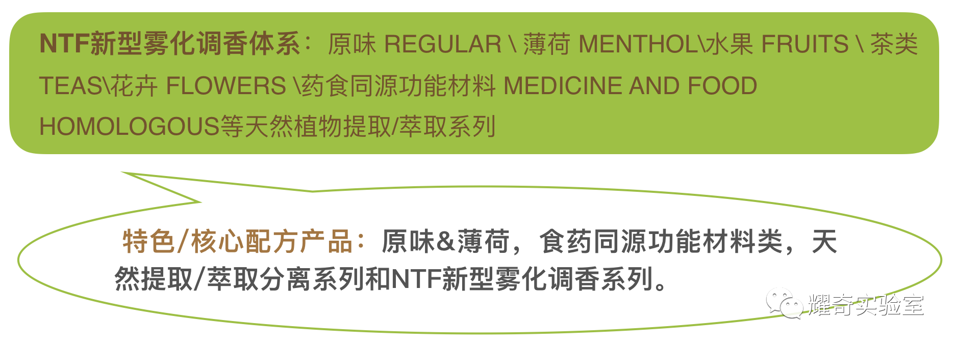 基于耀奇YQLAB的3000+配方数据库和1000+产品解决方案,及15年的调香经验及国际品牌客户服务经验为支持,根据客户具体需求,针对性提供“FY-NTF香味基团”、“FY-NTF新型雾化液配方产品”、“香型配方定制开发及技术服务”3类产品和服务。