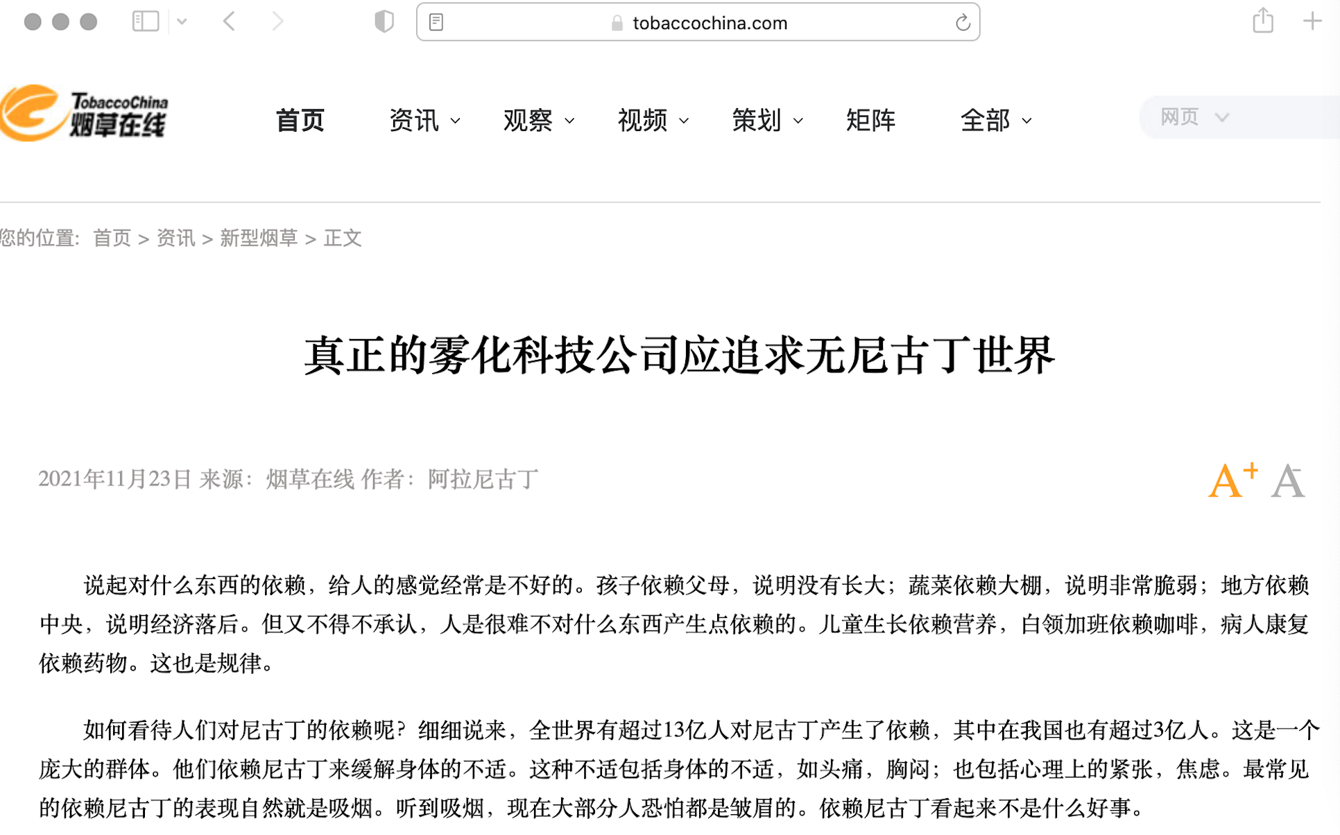 看到这里不由想起11月23日,烟草在线发布了一篇名为“真正的雾化科技公司应该追求无尼古丁世界”文章,有人觉得说到心坎里了,也有人口头争议但内心却是认同。