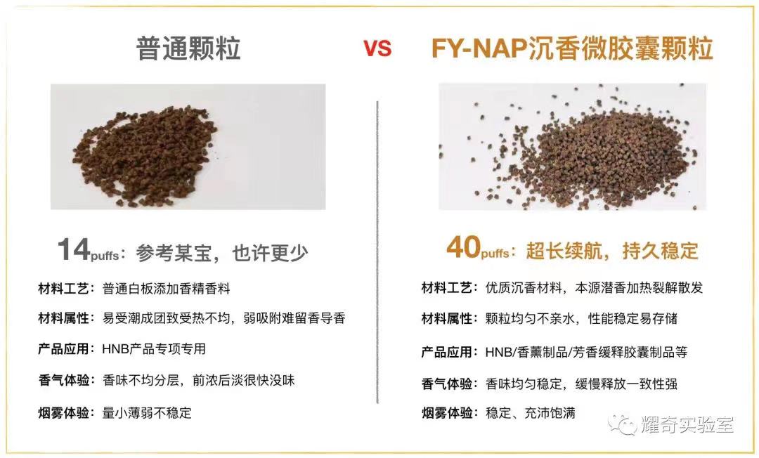 FY-NAP沉香微胶囊颗粒 是阜耀生物基于沉香价值功效(香中之王、名贵中药,利好呼吸道/肺部/胃部),将优质天然电白沉香材料及其分离物,经植物提取分离和微胶囊技术等,形成温度可控、香气及烟雾均匀、缓慢释放等优势的沉香微胶囊颗粒,可广泛应用于HNB、香薰制品、芳香缓释胶囊制品等烘烤型、呼吸类产品中。