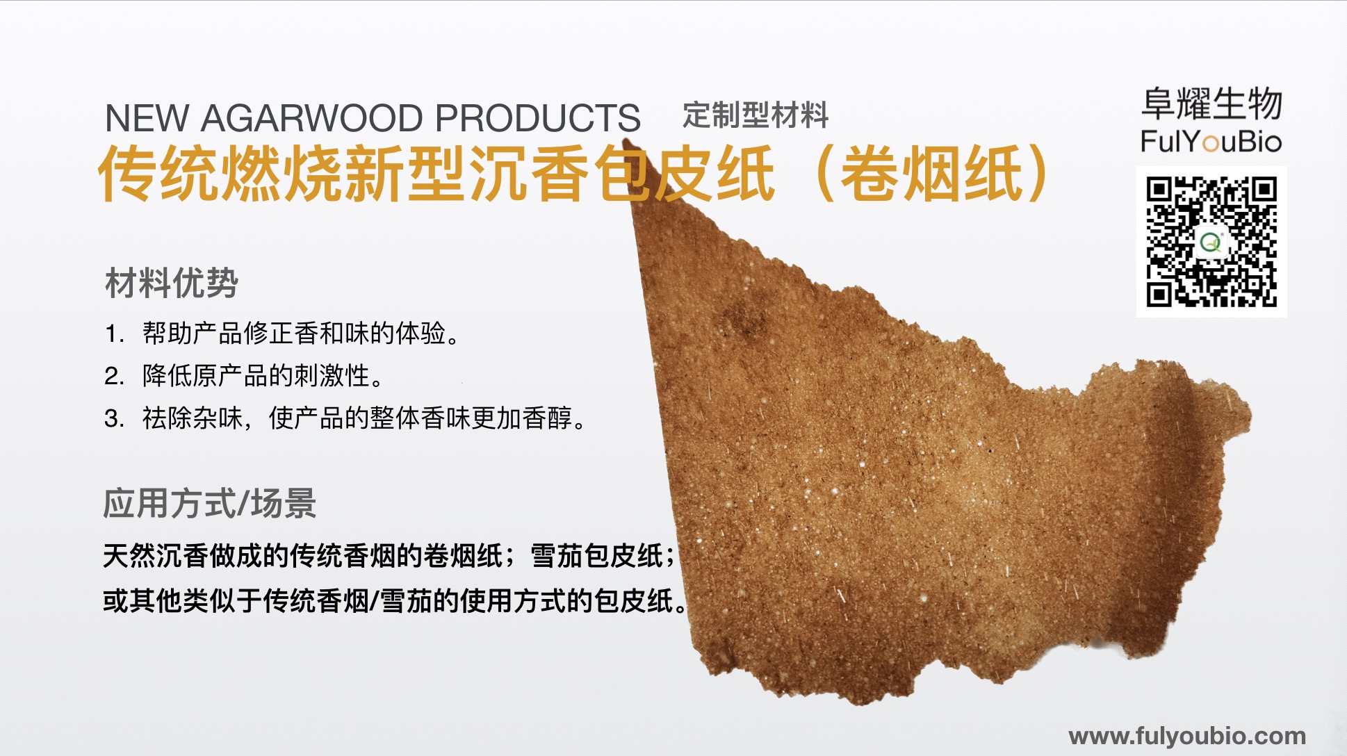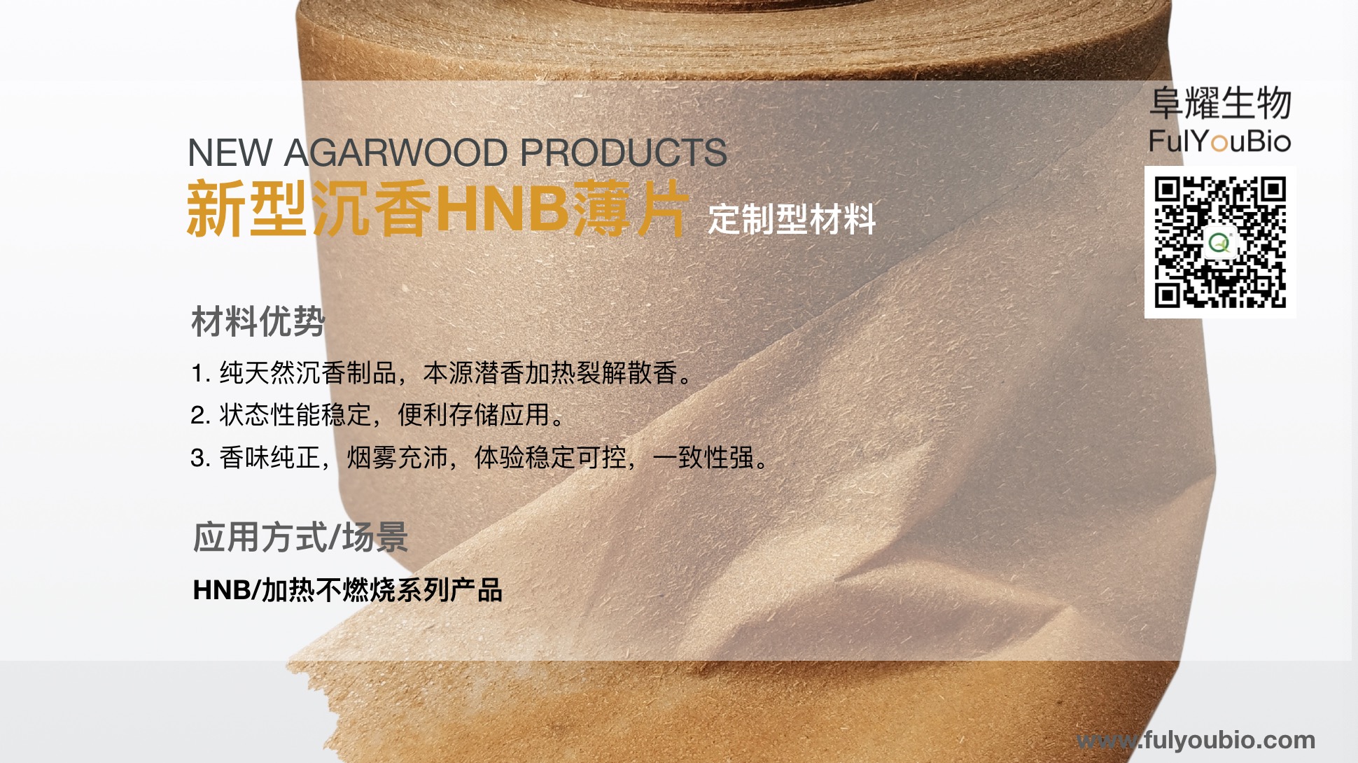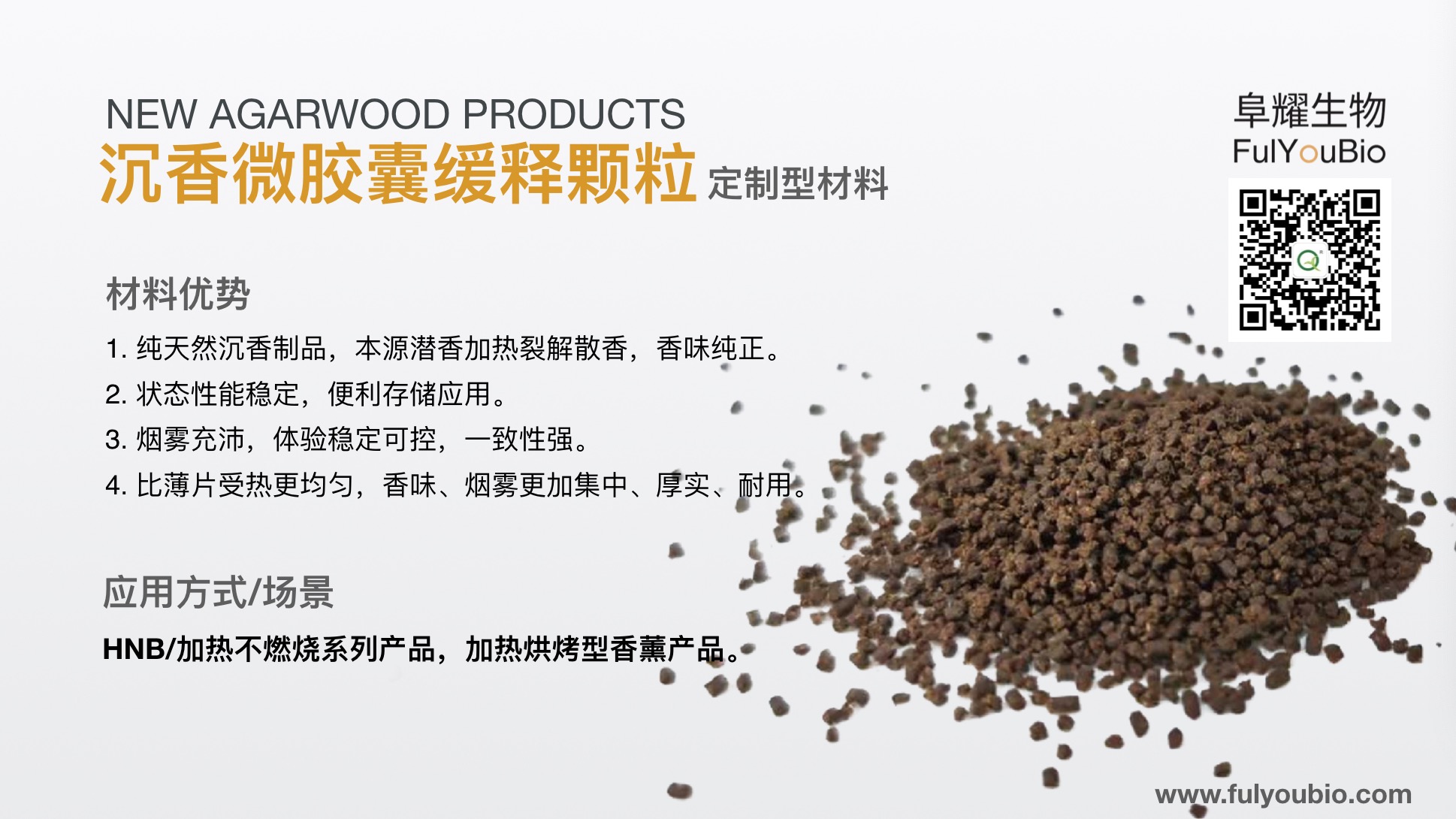 基于沉香的价值功效(香中之王,名贵中药,对呼吸道、胃部、肺部有奇效),将优质天然沉香木及其分离物,经植物提取分离应用和微胶囊技术等,形成具有温度可控,香气及烟雾均匀、缓慢释放等优点的新型沉香微胶囊颗粒、薄片、液体等特殊制品,广泛应用于HNB及香薰制品,芳香缓释微胶囊制品等烘烤型、呼吸类产品。