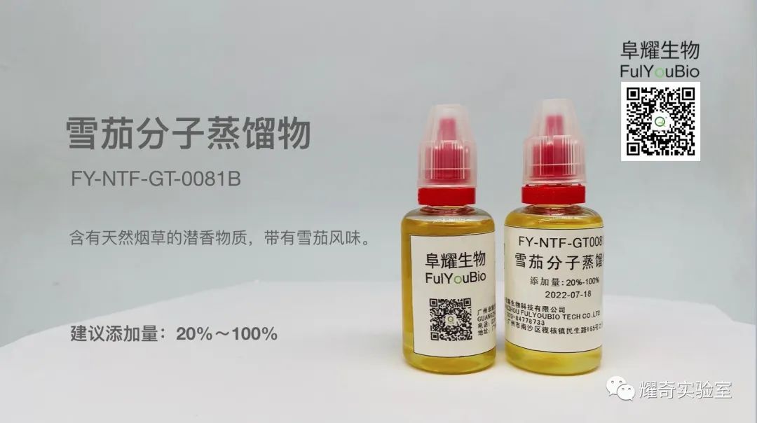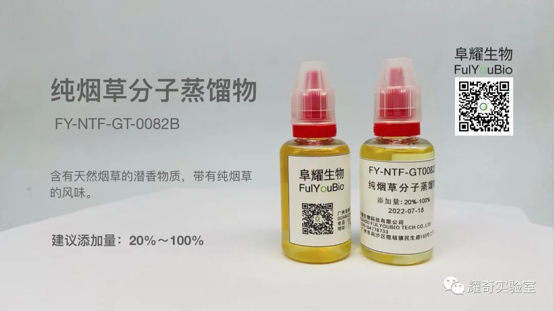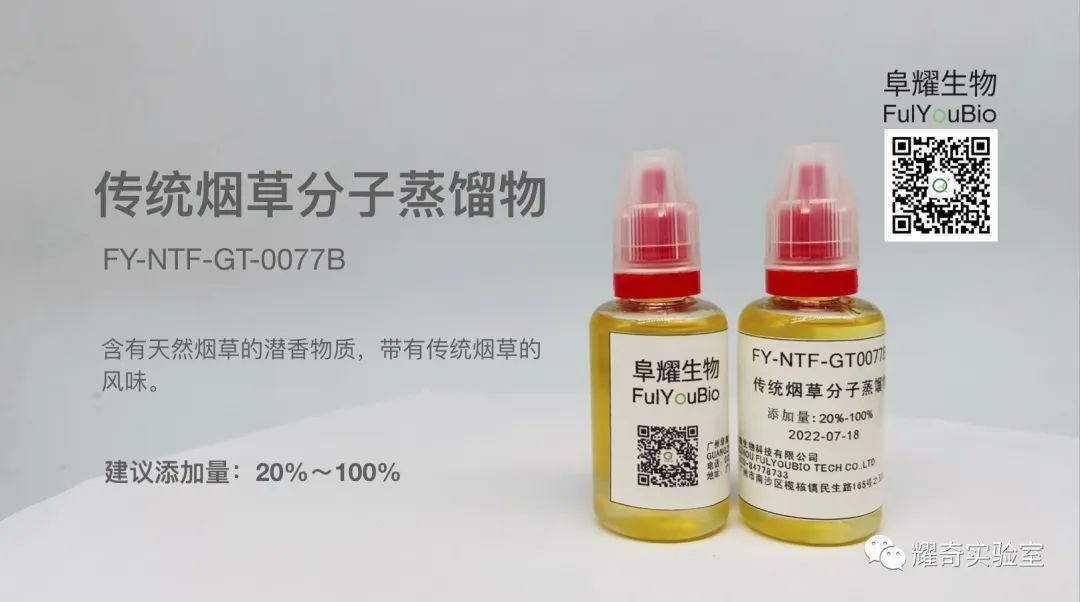 以“烟草风味”香味基团为代表的FY-NTF-GT香味基团,是“FY-NTF新型雾化板块材料”的重要成员,是阜耀生物NTF技术和雾化香料应用技术的核心,是雾化配方中的精华;而FY-NTF-GT系列分子蒸馏物则是雾化配方中的点睛之笔,通过加入不同比例的分子蒸馏物,可以是风味更加接近天然,香味更加逼真,配方效果更佳。