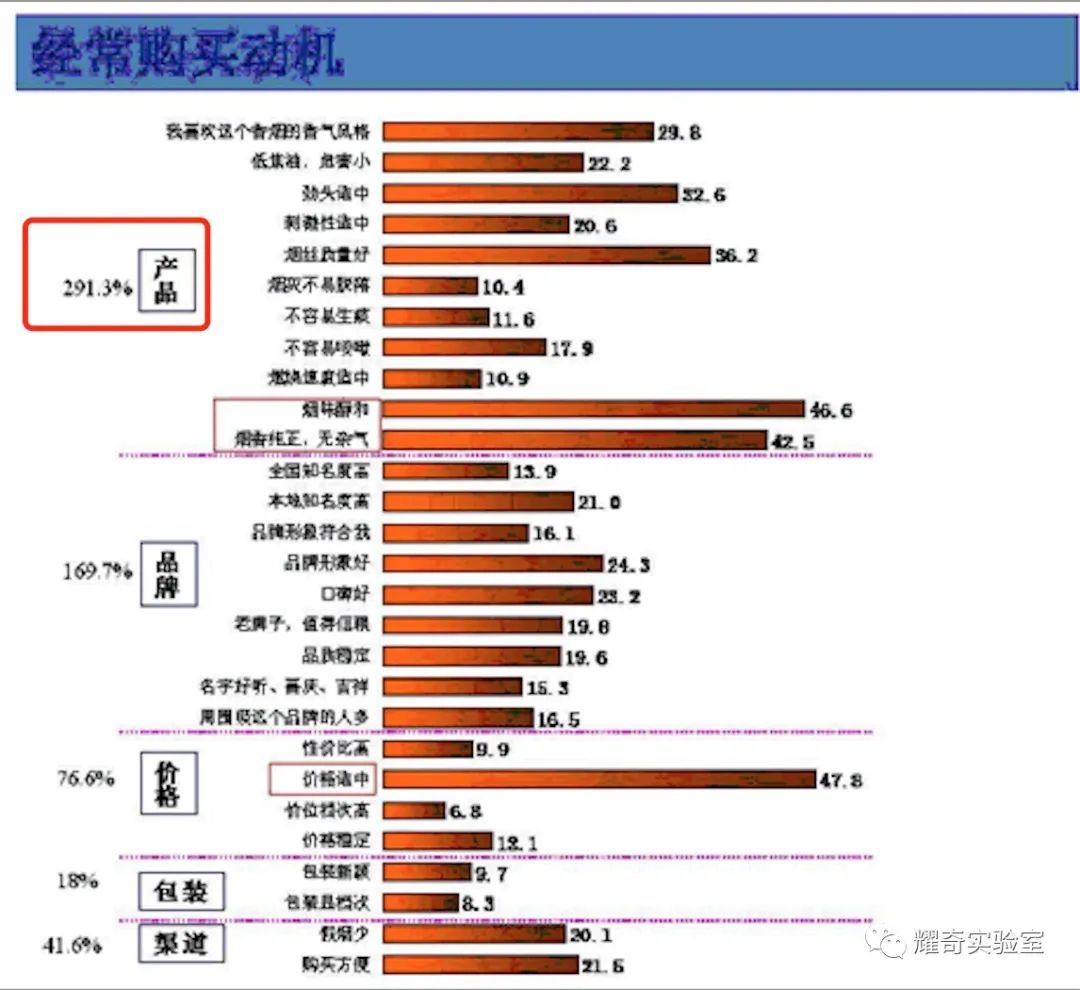 据调研分析,在吸烟健康意识方面,虽“吸烟有害健康”观念早已深入人心,但很大一部分传统烟民始终无法割舍传统卷烟,这群人比较关注传统因素,如口味、品牌、价格。 在众多需求因素中,产品口味依然是影响卷烟购买行为的主要动因,香型作为绝对刚性产品属性,直接制约和影响消费选择。