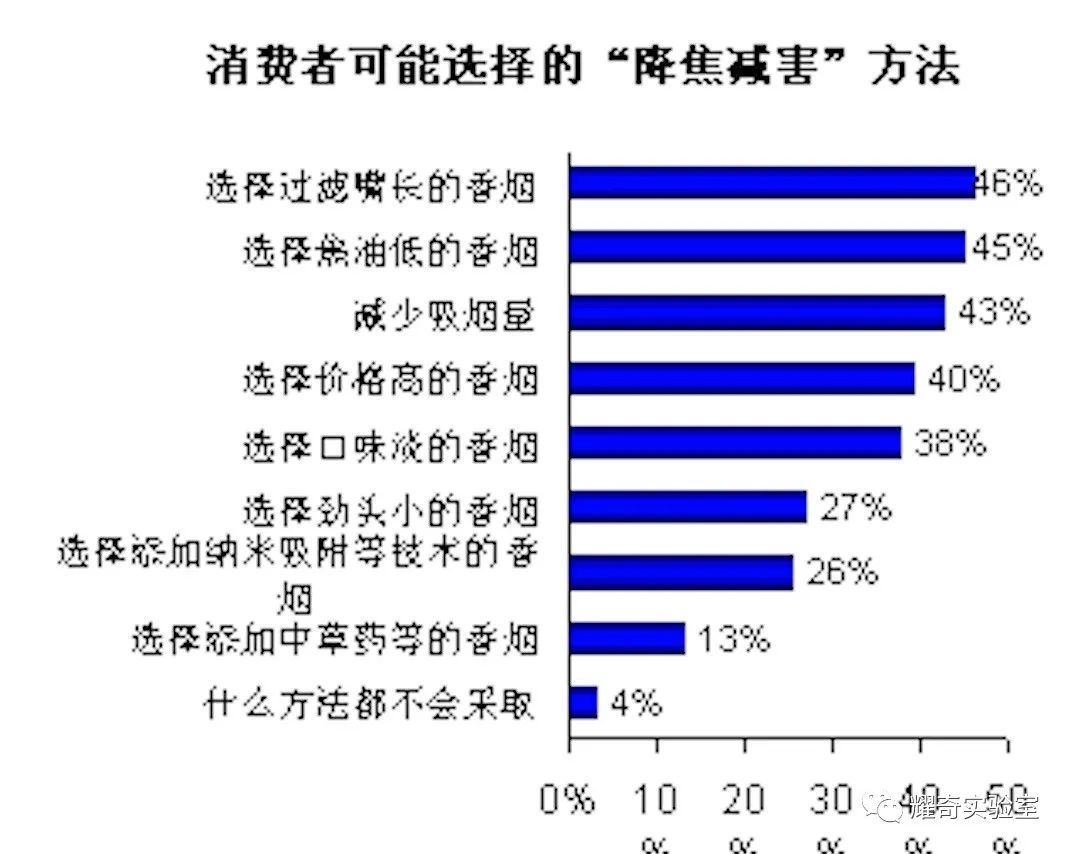 消费者在面对“如何减少吸烟时对健康的危害”问题上,会选择相对简单和保守的方式达到“降焦减害”的“目的”:选择过滤嘴长、焦油量低、减少吸烟量、选择价格高口味淡的等。