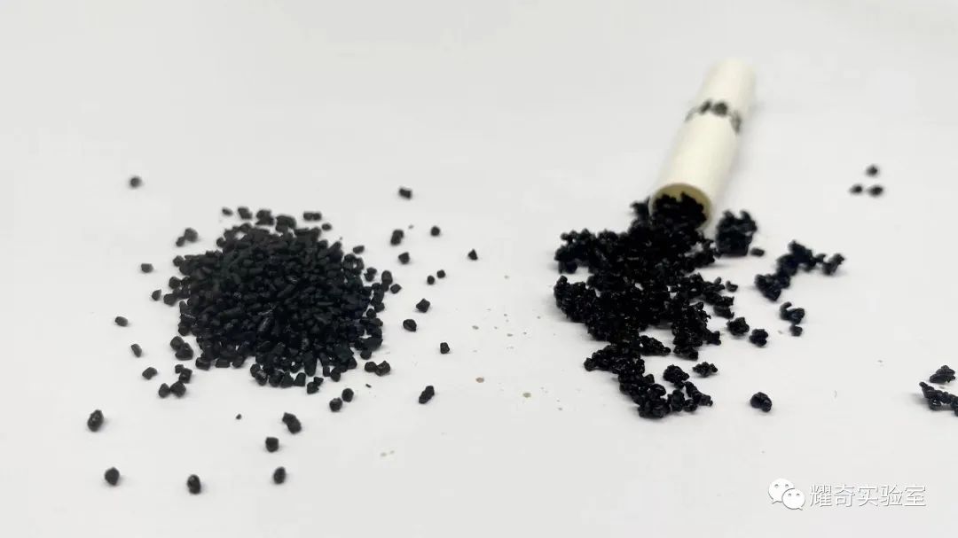 根据客户应用反馈:相较市面上不到10口就耗尽的产品,类似材料同等用量,该颗粒材料应用于电子烟用滤嘴产品中最高可达150口;应用于传统卷烟滤嘴中可过滤3~5根传统香烟。