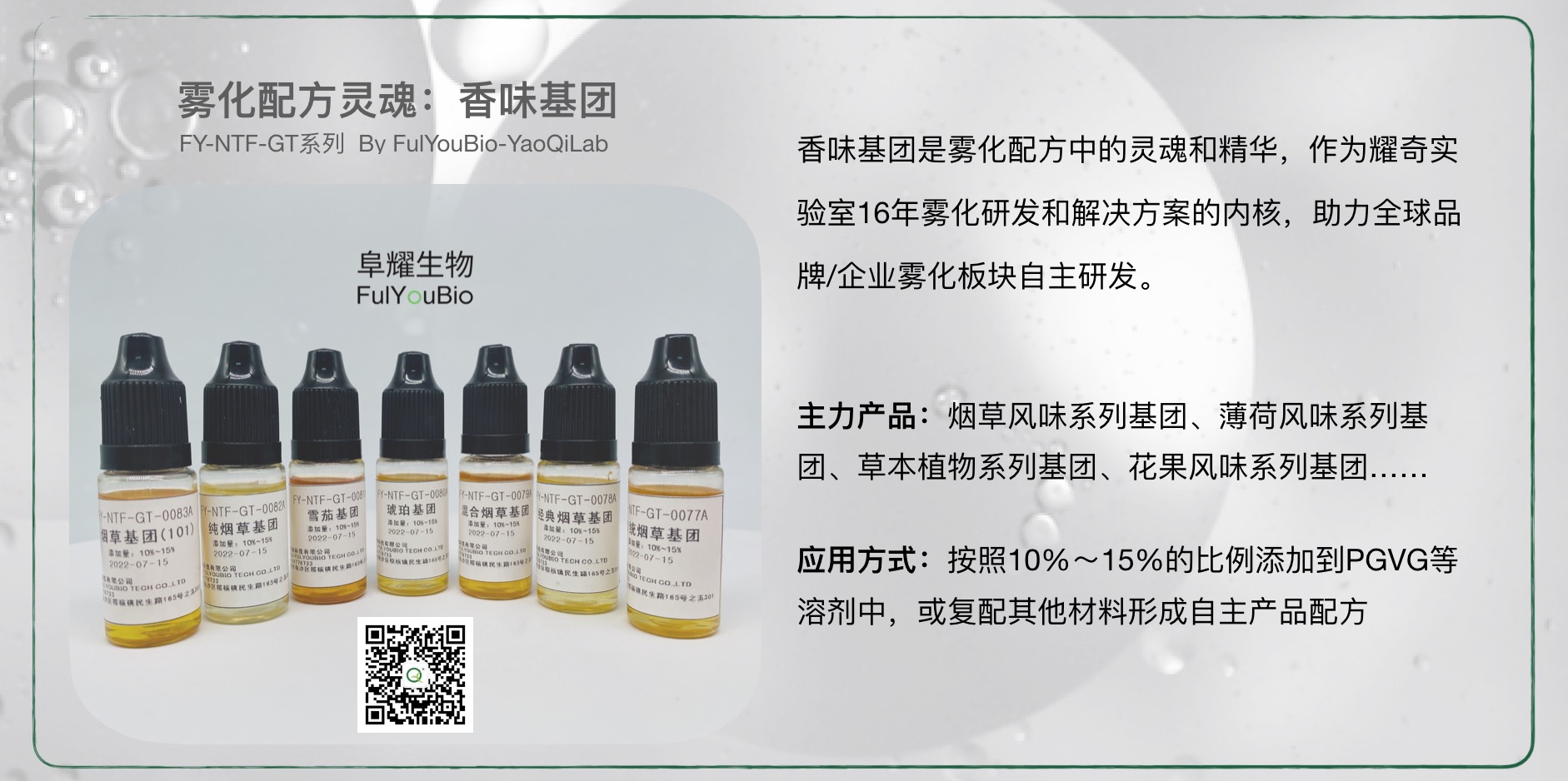 伴随全球电子烟产业逐步进入规范化发展阶段,各国加速电子烟国标管理进程,在风味管控等细节管理上更加清晰、专注,针对趋势及各品牌企业产品应用需求,推出“烟草风味系列”专题香味基团和分子蒸馏物材料,帮助企业/品牌掌握雾化物自主配方,赢得新一轮市场竞争主动权: