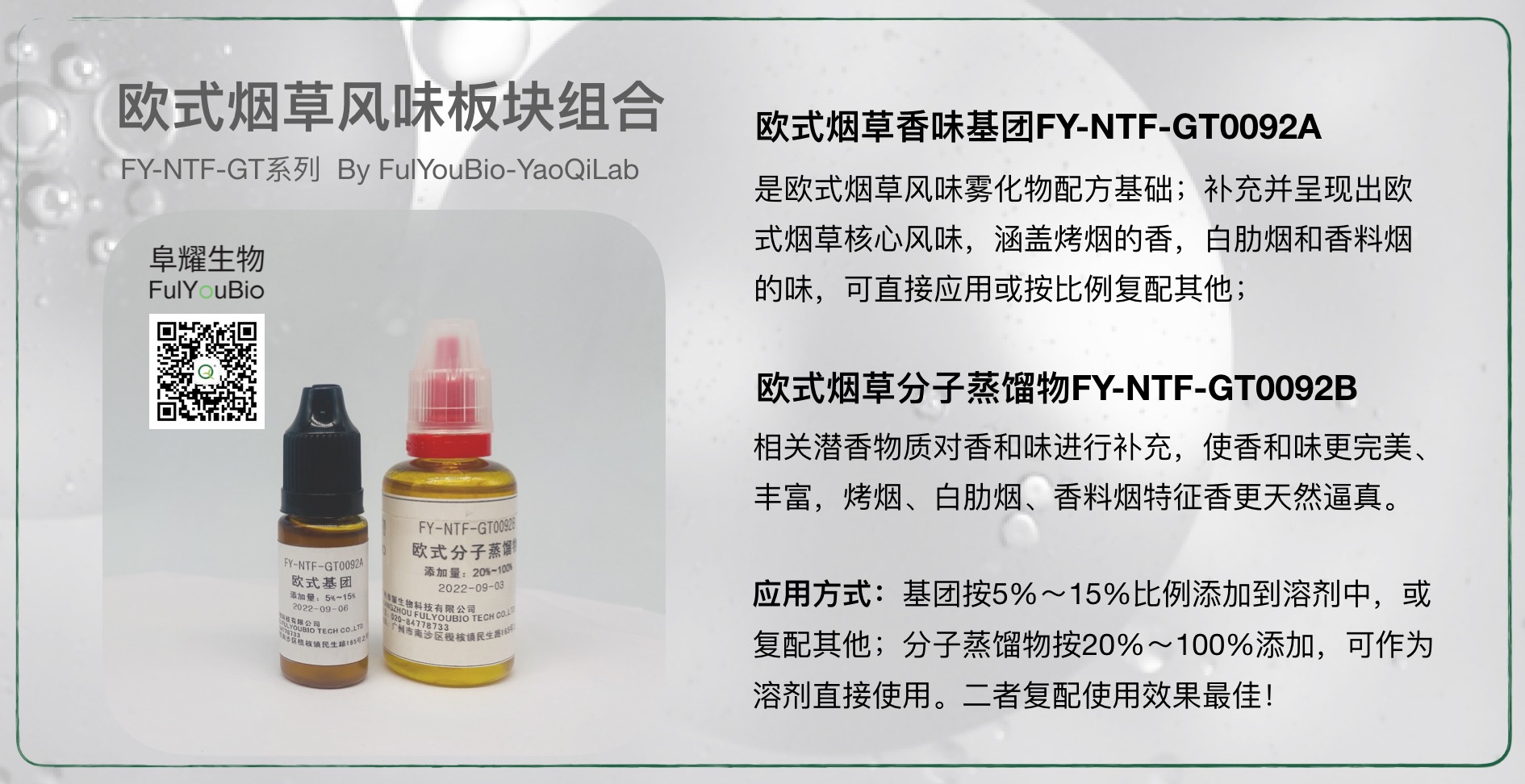 伴随全球电子烟产业逐步进入规范化发展阶段,各国加速电子烟国标管理进程,在风味管控等细节管理上更加清晰、专注,针对行业趋势及各品牌企业产品应用需求,推出“烟草风味系列”雾化物专用香味基团和分子蒸馏物板块材料,帮助企业/品牌掌握雾化物自主研发和配方管控,赢得新一轮市场竞争主动权:
