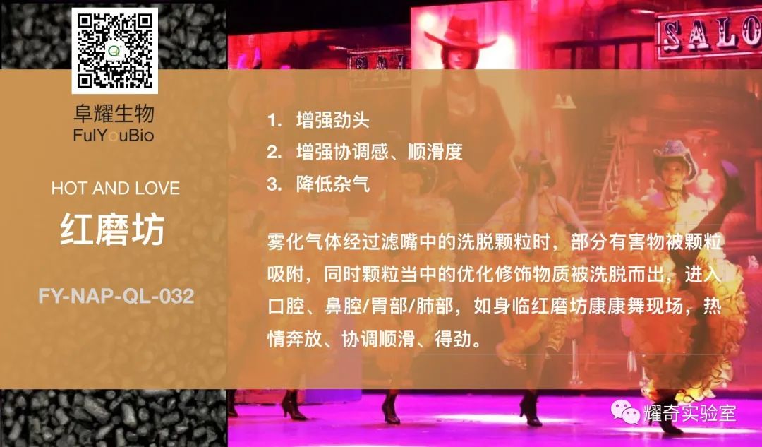 阜耀生物的烟用滤嘴气流颗粒材料,精选天然植物纤维、食品级香料及药食同源植物提取物,经粉碎研磨、调香应用、精细造粒等多重工艺流程和技术,研制而成的新型气流洗脱颗粒,可广泛应用于传统卷烟、电子烟、雪茄等领域的滤嘴产品中,少量即可帮助过滤嘴产品以更低成本、更少用量、更好的效果同时实现过滤吸附、降焦减害、修饰烟气、丰富体验等目的。