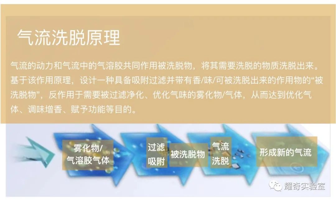 基于该“流动力+气溶胶”作用原理,如果我们设计一种材料,让这种材料具备过滤吸附功能,并且自身带有香气/香味/可通过洗脱带出来的物质,利用气流洗脱原理,反向作用于需要净化/优化的气体,从而使气体中的部分物质被吸附过滤,同时,气流把材料中的香/味等物质洗脱出来,从而形成新的气味体验。