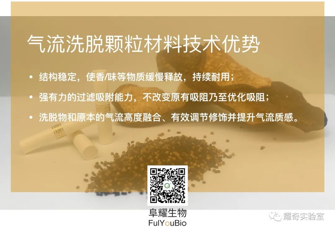 烟用滤嘴专用气流洗脱颗粒是阜耀生物研发“洗脱颗粒”材料的起点,也是该类材料的应用创新的开端,基于“气流洗脱”技术原理,该颗粒材料可广泛应用于气体过滤、调味调香等跨行业产品和跨界场景中。