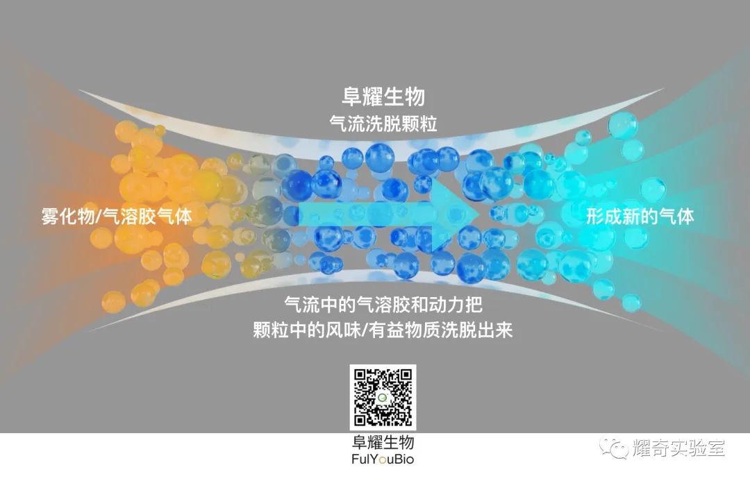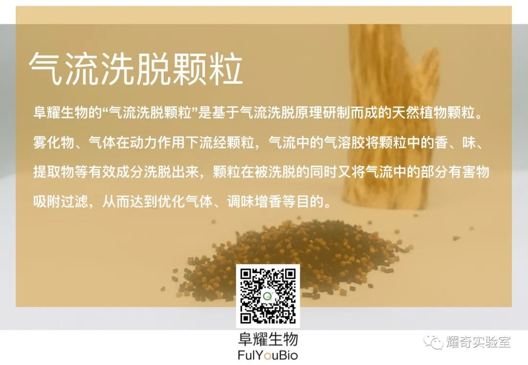 精选天然植物纤维、食品级香料及药食同源植物提取物,经粉碎研磨、调香应用、精细造粒等多重工艺流程和技术,研制而成的新型气流洗脱颗粒,基于“气流洗脱原理”,使雾化物等含气溶胶的气流在动力作用下经过颗粒时,气流中的有害物等物质被颗粒过滤吸附,同时气流将颗粒中的香气/香味/提取物等物质洗脱出来,从而达到净化气体、增香调味等目的。