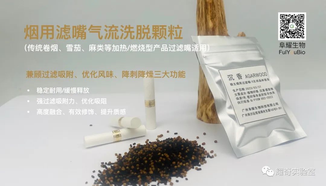 相较于其他同类/类似材料,阜耀生物的气流洗脱颗粒以绝对的原料优势、精细的制造工艺流程和独有的专利技术,在国内材料和技术领域处于领先水平,并且材料已成熟应用于烟用滤嘴产品中,帮助解决过滤、优化烟气,降刺降燥,降焦减害等目的。基于材料特性和技术原理,该颗粒材料可广泛应用于气体过滤、调味调香等跨行业产品和跨界场景中。