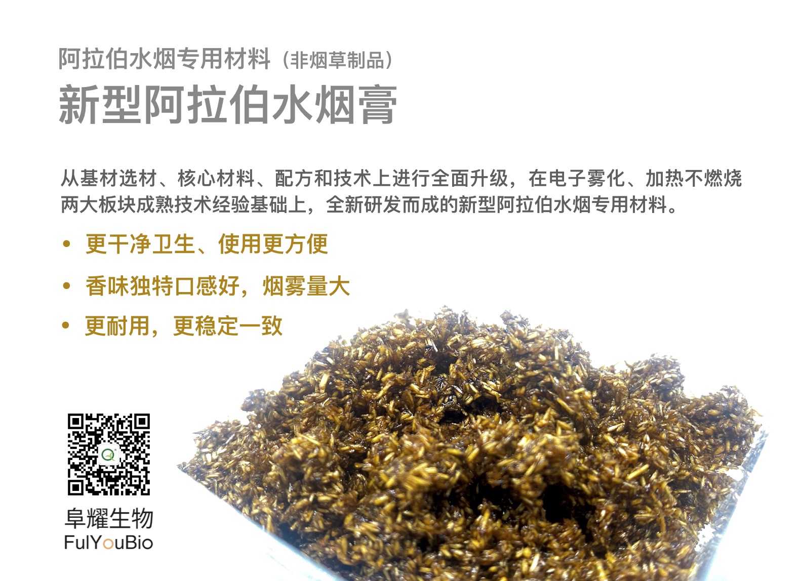 区别于传统的阿拉伯水烟膏,我们从基材选材、核心材料、配方和技术上进行全面升级,在电子雾化、加热不燃烧两大板块成熟技术经验基础上,全新研发而成的新型阿拉伯水烟专用材料,相较于传统水烟膏,材料具有下列优势: