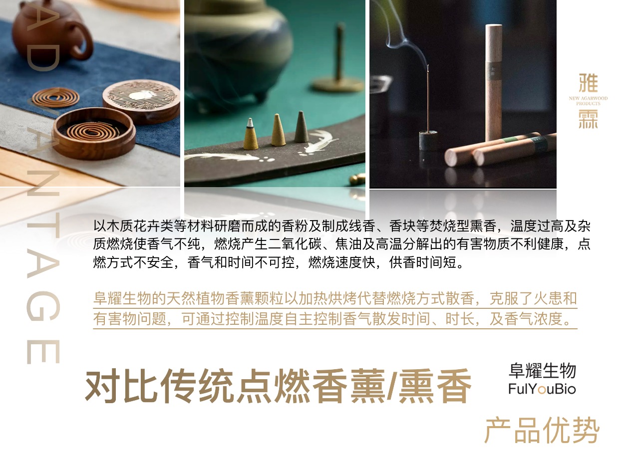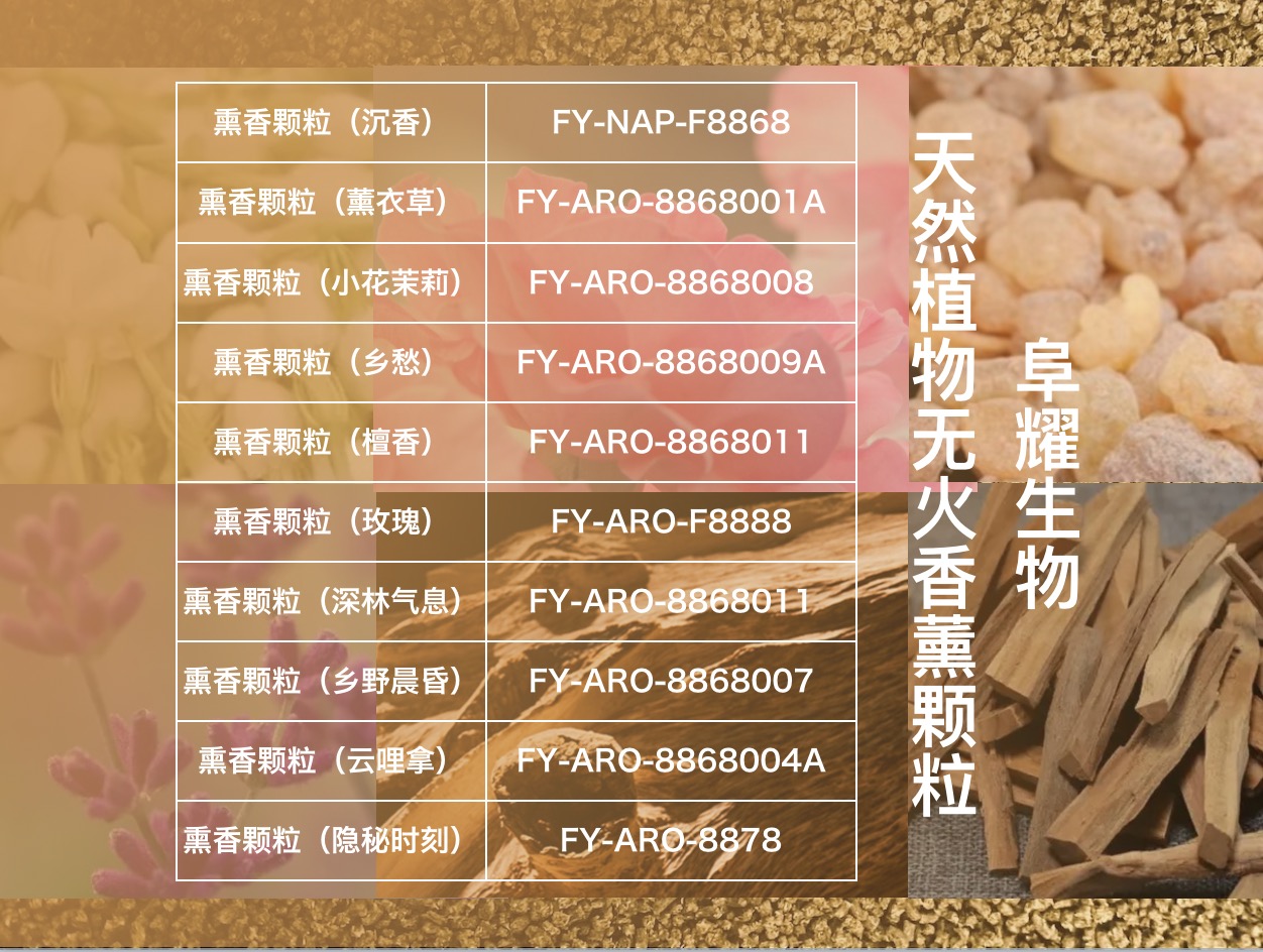 阜耀生物基于自身材料和技术优势,针对性研制出一款创新材料“天然植物无火香薰颗粒”,优选全球最优,只用天然植物材料,采用多项成熟专利技术和工艺流程,匠心精工研制而成的具有温度、香气浓度可控,缓慢均匀释放优势的天然植物无火香薰颗粒。