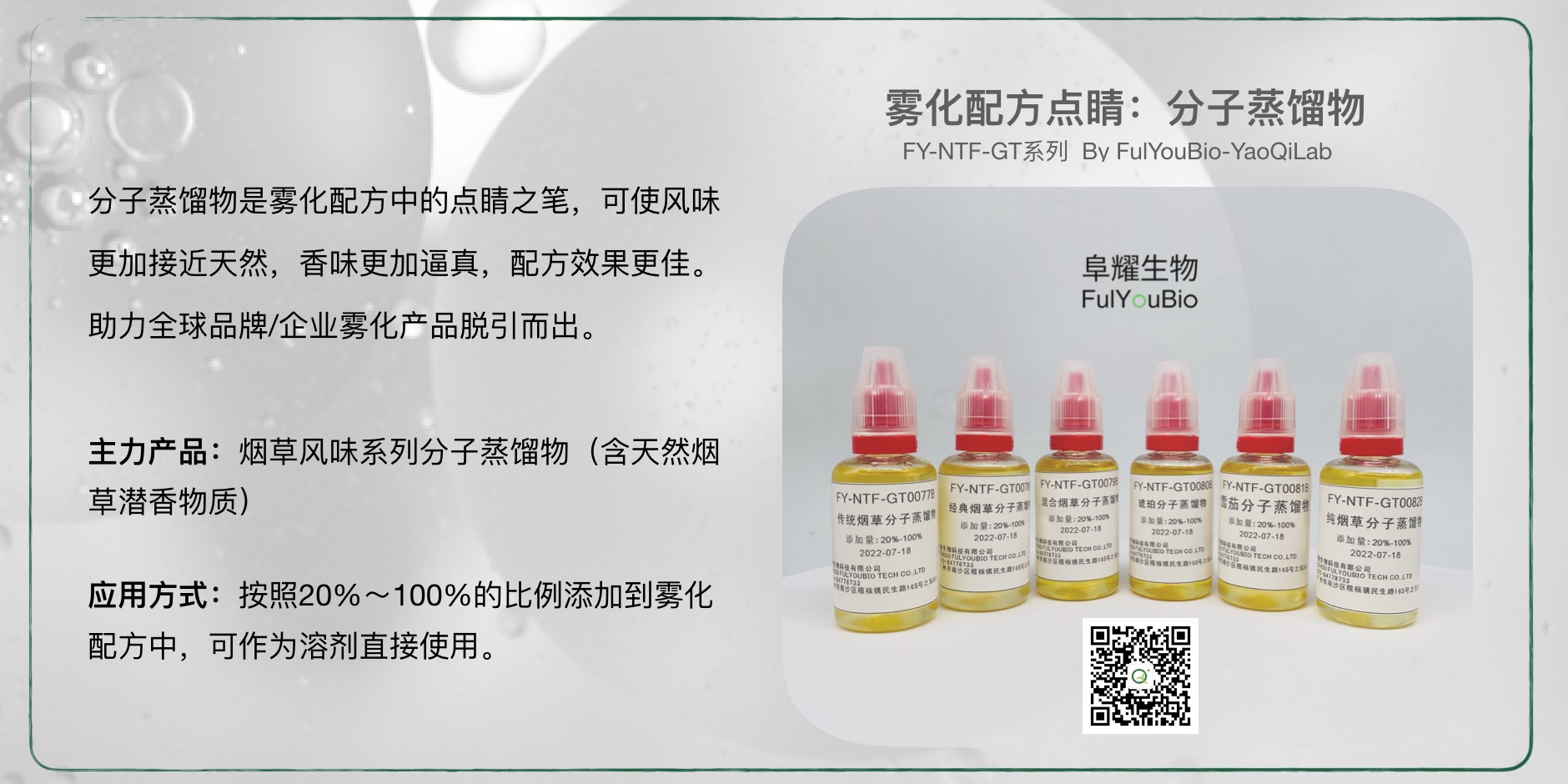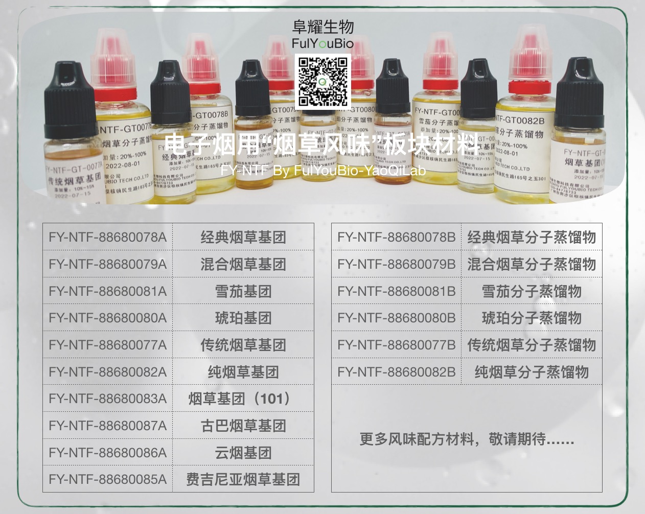 伴随全球电子烟产业逐步进入规范化发展阶段,各国加速电子烟国标管理进程,在风味管控等细节管理上更加清晰、专注,针对趋势及各品牌企业产品应用需求,推出“烟草风味系列”专题香味基团和分子蒸馏物材料,帮助企业/品牌掌握雾化物自主配方,赢得新一轮市场竞争主动权: