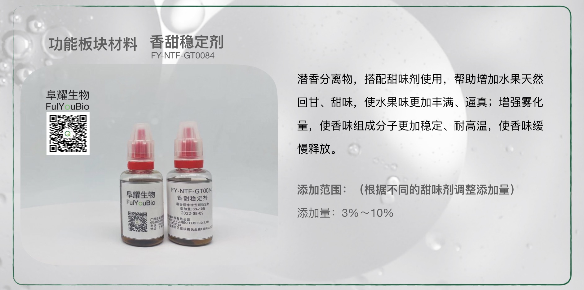潜香分离物,搭配甜味剂按3%~10%的添加量使用,帮助增加水果天然回甘、甜味,使水果味更加丰满、逼真;增强雾化量,使香味组成分子更加稳定、耐高温,使香味缓慢释放。